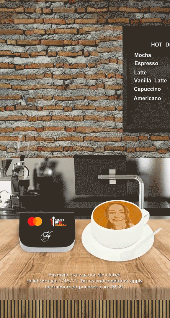 In this experience, users "tapped to pay" with their Mastercard, complete with their Snapchat username, and were then personally greeted by Brown. From behind the counter, he explained the promotion and presented a virtual latte featuring the user's face in the foam, mirroring the TV moment.