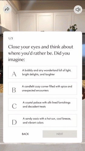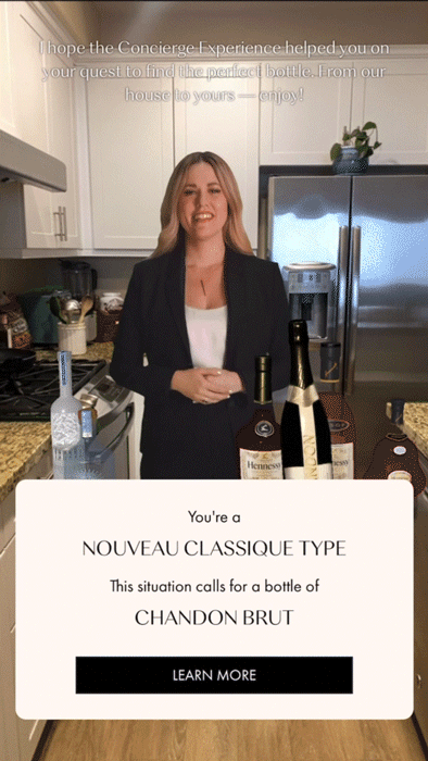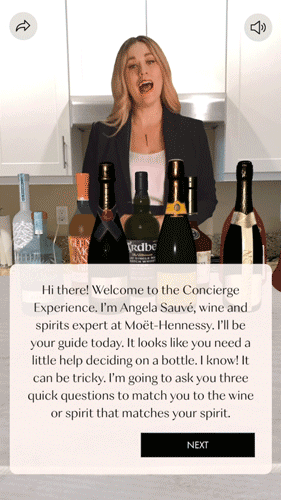 Moët Hennessy customers were able to find their perfect bottle using the Virtual Wine And Spirits Concierge. After tapping to place the experience, users were prompted to answer a series of “get-to-know-you” questions. The responses determined which of eight personality types the user aligned with, each paired with a Moët Hennessy wine or spirit that best complemented it.